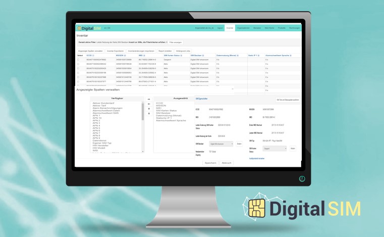 Mit einem SIM-Managementportal erhalten Sie zuallererst einen Überblick über alle eingesetzten SIM-Karten. Zu jeder Karte werden Statusinformationen und Stammdaten angezeigt. Dies erfolgt im sogenannten „Inventar“. Darüber hinaus können eigene Daten wie Standorte, Anlagenbezeichnungen oder Kundeninformationen hinzugefügt werden. Das erleichtert die Zuordnung von SIM-Karte zum jeweiligen Gerät oder Endpunkt.